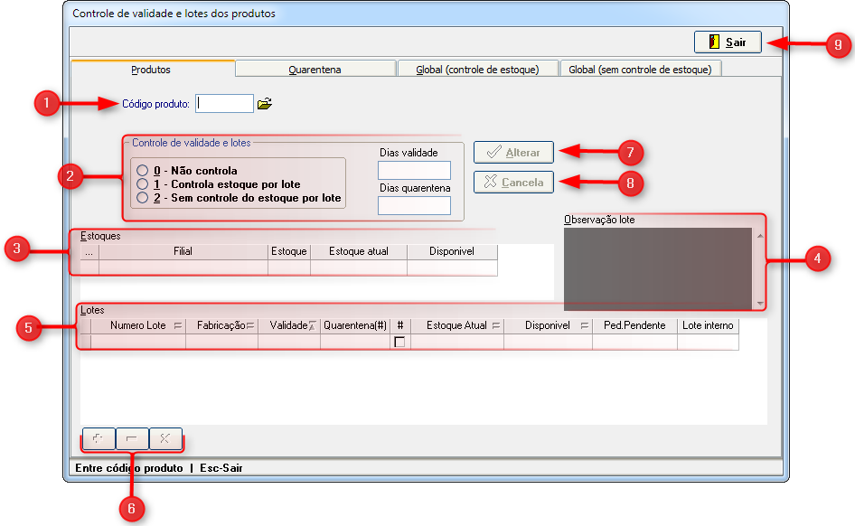 9) Botão Sair: Sai da tela “Controle de validade e lotes dos produtos”.