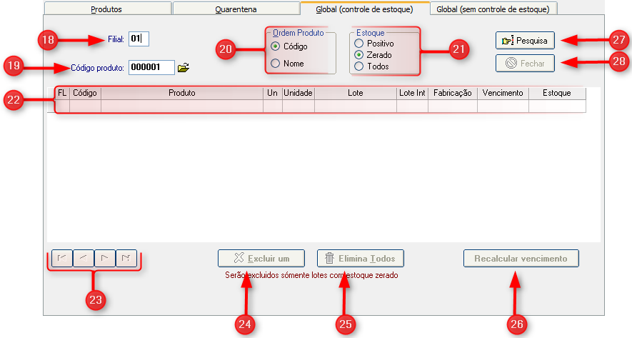 22) Tabela global com controle de estoque: Mostra a tabela global com controle de estoque dos produtos com os dados: filial, código do produto, produto, un, unidade, lote, lote interno, fabricação, data de vencimento e estoque.