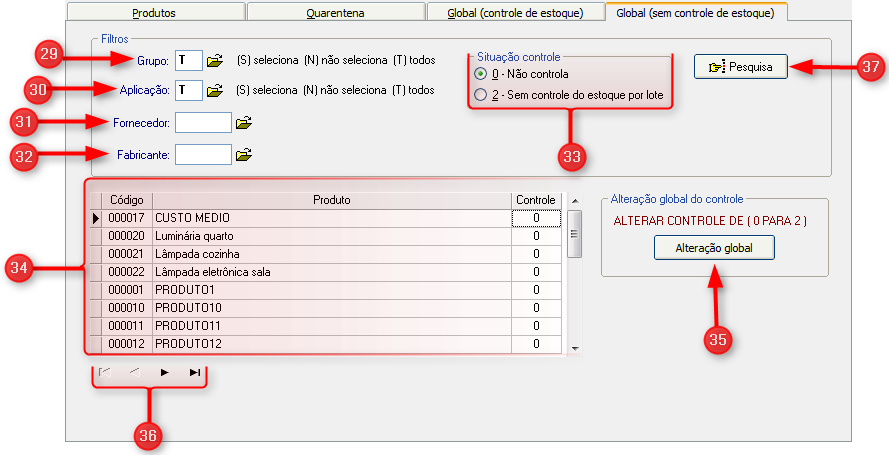37) Pesquisa: Permite pesquisar de acordo com os filtros selecionados e visualizar a tabela global sem controle de estoque (campo 34).