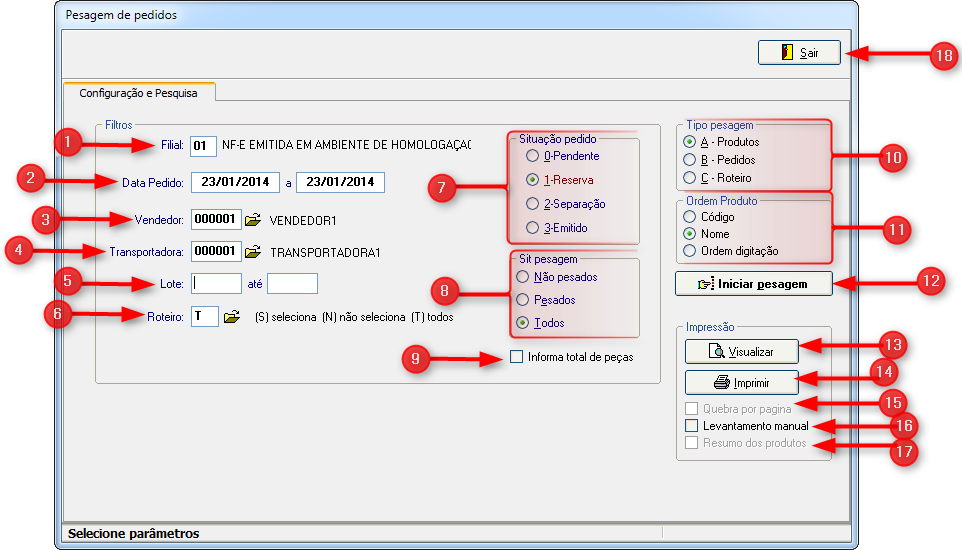 18) Botão Sair: Sai da tela “Pesagem de pedidos”.
